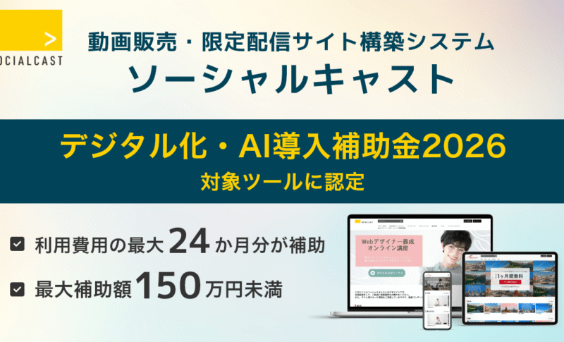 弊社が開発・販売しております「動画販売・限定配信サイト構築システム ソーシャルキャスト」が、経済産業省が推進するサービス等生産性向上IT導入支援事業「デジタル化・AI導入補助金2026」において、補助対象となったことをお知らせいたします。